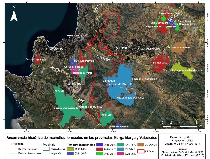 Esta imagen satelital muestra, en rojo, las áreas afectadas por los incendios en la zona de Valparaíso y Viña del Mar. (Crédito imagen: Instituto de Geografía UC)