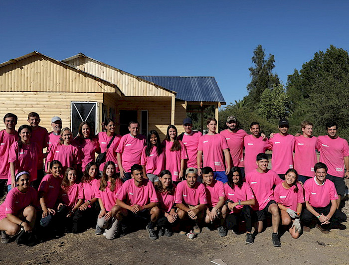 photo_camera En la imagen se observa un grupo de voluntarios del proyecto Viviendas, que construyó 7 casas en Lampa y Batuco (Región Metropolitana). Detrás de ellos se puede ver una de las casas que construyeron. Fotografías: Karina Fuenzalida y César Cortés.