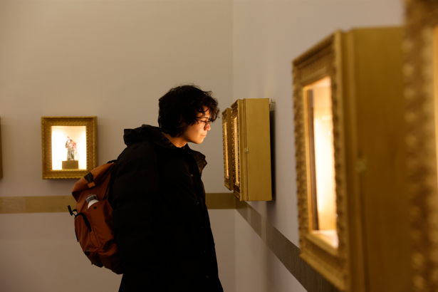 Al interior de la muestra, las paredes blancas de la galería potencian aún más el efecto lumínico que generan la treintena de esculturas dispuestas entre vitrinas y marcos individuales: estos marcos se asemejan a pequeños altares de luz dorada, como cofres brillantes, desplegados en los muros para quien se acerque a descubrir el misterio de emociones y gestos que cada uno de ellos atesoran adentro.