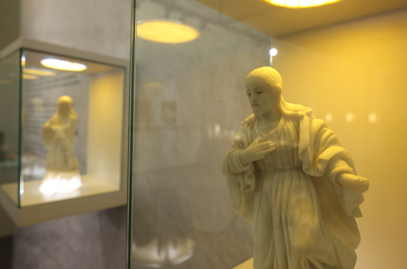 La piedra Huamanga pareciera reflejar un color casi ámbar, dejando un eco dorado en el aire. Hay algo en esa aura cálida que se desprende de las esculturas talladas en este material, y que “parece tocar lo vivo, sugiere una emoción bajo la superficie y tiene una teatralidad profunda”, según destaca Alexei Vergara, decano de la Facultad de Artes, en el catálogo de la nueva exposición “Alabastro Andino, piedad en piedra Huamanga”, inaugurada en la Sala Joaquín Gandarillas del Centro de Extensión UC Alameda.
