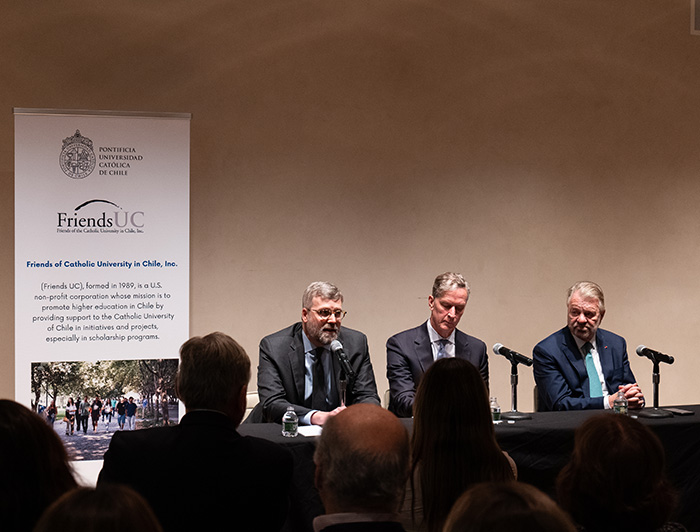 El rector Ignacio Sánchez agradeció a Friends UC y su junta directiva, “para nosotros, este apoyo de Friends UC ha sido muy importante, desde más de 35 años, por lo que este encuentro es un ejemplo de colaboración conjunta”, dijo. Asimismo destacó a Julie Mostov, decana de Liberal Studies de NYU, por su recepción como anfitriona de la actividad; y a los expositores. “Me gustaría dar la bienvenida a todos los exalumnos que están aquí, muchos jóvenes que están haciendo maestrías, programas de doctorado o que están trabajando aquí en Estados Unidos”, añadió.
