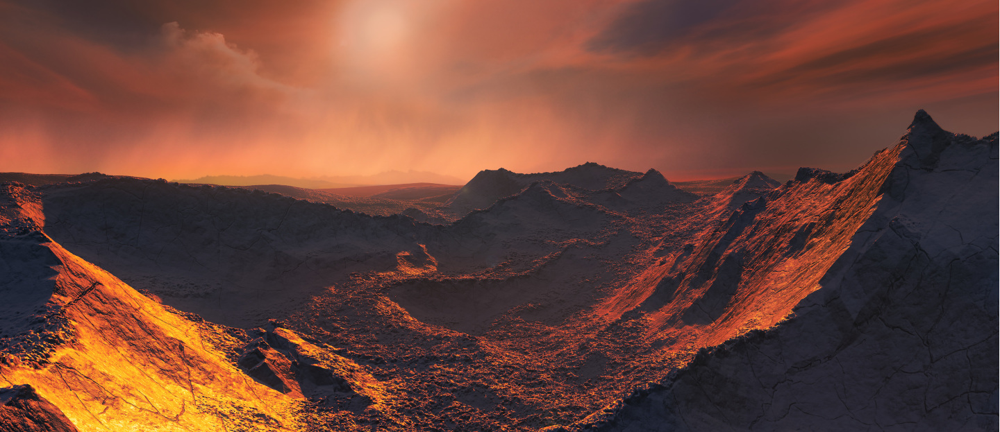photo_camera La estrella más cercana al Sol alberga un exoplaneta, al menos 3,2 veces más masivo que la Tierra, la llamada súper-Tierra. Esta imagen muestra la impresión de un artista de la superficie del planeta. Crédito: ESO/M. Kornmesser