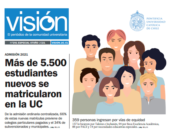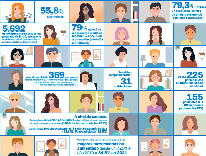El tema central del periódico entrega un perfil de los casi seis mil matriculados en la UC en la admisión 2021 (pág. 10). 5.692 personas se matricularon en la universidad. De esta cifra global, 62,3% proviene de colegios particulares pagados, 26,4% de particulares subvencionados y 11,3% de establecimientos públicos. Además, 55,8% de estas matrículas corresponde a mujeres. ¿Y a nivel de carreras? Considerando las llamadas STEM (por las siglas en inglés para Ciencia, Tecnología, Matemática e Ingeniería), la proporción de mujeres ha aumentado desde un 25,5% en 2010 a 34,8% en 2021.