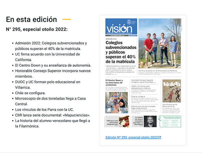 El acuerdo firmado entre el vicerrector de Investigación, Pedro Bouchon, y sus contrapartes de la Universidad de California para realizar investigación en las 41 reservas naturales de esta entidad estadounidense, junto a las cifras de las matrículas de la admisión 2022, son los temas destacados en la última edición de Visión UC: el diario de la comunidad universitaria, edición 295.