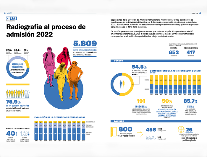 La noticia principal de la portada de este número da cuenta que, por primera vez en la universidad, los estudiantes de colegios públicos y subvencionados superaron el 40% de la matrícula. Según datos entregados por la Dirección de Análisis Institucional y Planificación -al 2 de marzo-, 5.809 estudiantes se matricularon en la UC, otra cifra récord plasmada en el artículo infográfico "Radiografía al proceso de admisión 2022".