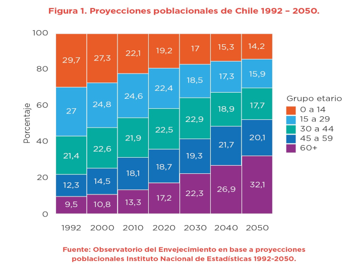 A través de los datos obtenidos en el estudio ¿Está Chile Preparado para Envejecer?, se destaca que desde 2010 la fuerza laboral en Chile ha ido envejeciendo, llegando en 2019 a tener el 50% de esta una edad igual o superior a 41,2 años; una cifra superior a lo que registran países como Uruguay y Argentina, y muy lejos de Brasil, Bolivia o Colombia, que no superaban los 38 años. Además, hacia 2031 la población en edad de trabajar llegará a su máximo estimado de 13.77 millones de personas, para luego iniciar una disminución nominal, hasta llegar en 2050 a 13.13 millones de personas, un 27.7% mayor a la de 2002, pero aproximadamente 640.000 personas menos que las del año 2031. Por otro lado, se estima que la población mayor seguirá aumentando en el país, ya que para el 2050 se proyecta que las personas sobre 60 años serán el 32,1% (3 de cada 10 habitantes).