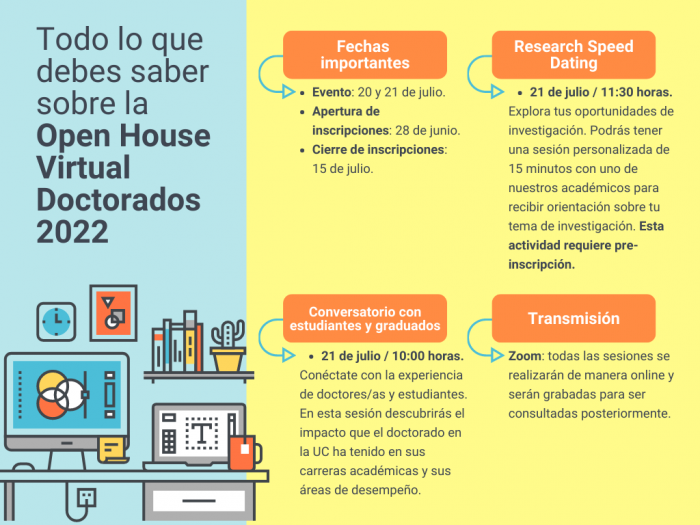 Todas las actividades de la Open House Virtual 2022 están creadas para clarificar las dudas de los participantes sobre los estudios de doctorado en la UC, ampliar el horizonte de la investigación y el campo laboral, además de ayudarlos a crear redes de contactos. Para mayor información, el programa completo está disponible haciendo click aquí.