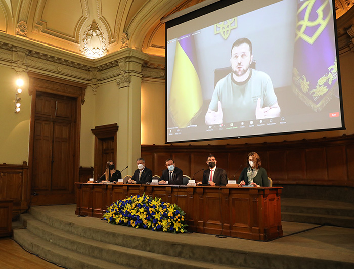 El encuentro virtual con el presidente Zelenski contempló preguntas de estudiantes, académicos y periodistas y fue el primero sostenido con el público latinoamericano. Su principal objetivo fue conocer la realidad que está viviendo la población ucraniana de primera fuente y también cómo la acción bélica de parte de Rusia ha afectado sus vidas.
