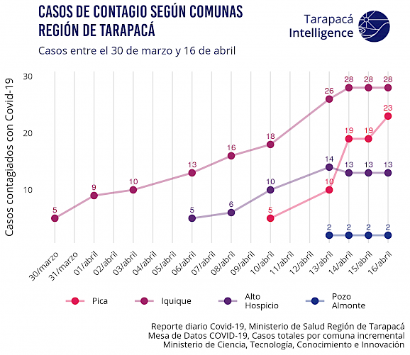 En la imagen se muestra que, de acuerdo a la información proporcionada por la Mesa de Datos del Ministerio de Ciencia, Tecnología e Innovación, el mayor número de contagios se presenta en las comunas urbanas. Además, se detecta un brote significativo en la comuna de Pica. La información desglosada a nivel comunal presenta un desfase respecto del consolidado de casos a nivel regional, debido a los plazos en los cuales se disponen los datos en el repositorio abierto. (Fecha de actualización: 13 de abril de 2020)