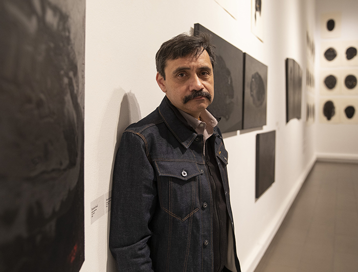 Disponible hasta el 25 de noviembre, con entrada liberada, la exposición reúne la obra reciente del también académico de la Escuela de Arte UC. Con pinturas en base a acrílico negro y otras piezas en carbón -además del uso de la mancha como método pictórico-, aquí se genera una muestra que exige presencialidad, para poder distinguir los contrastes del ultranegro y los simbolismos presentes en cada obra.