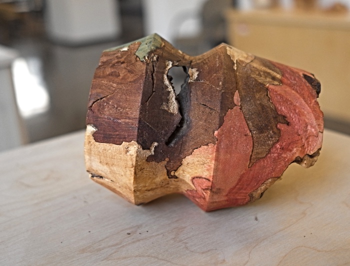 Hubo un hito en la carrera del profesor de la Escuela de Arte Luis Prato. En 2018, fue invitado a participar de un taller en la Universidad Austral de Chile, en Valdivia, “Usos contemporáneos de la madera: pigmentación de hongo en proceso de color”, dictado por el profesor de la Oregon State University y bio-artista, Seri Robinson. Rodeado de artesanos, ingenieros forestales y científicos especialistas en bosques, el académico sintió la necesidad de volver a este material, utilizado ubicado en los orígenes de su trabajo como escultor.