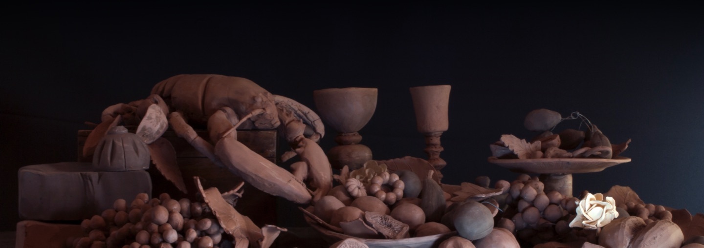 La muestra está encabezada por un abundante banquete de langosta, vegetales, dátiles y lácteos confeccionados con greda. En palabras de la artista: “La greda está cruda, por eso su opacidad. Las artesanías de Pomaire y Quinchamalí tienen un pequeño brillo porque son horneadas. El banquete que presento es seco y se resquebraja, porque me interesaba jugar con ese aspecto precario y dejar en evidencia su fragilidad”.