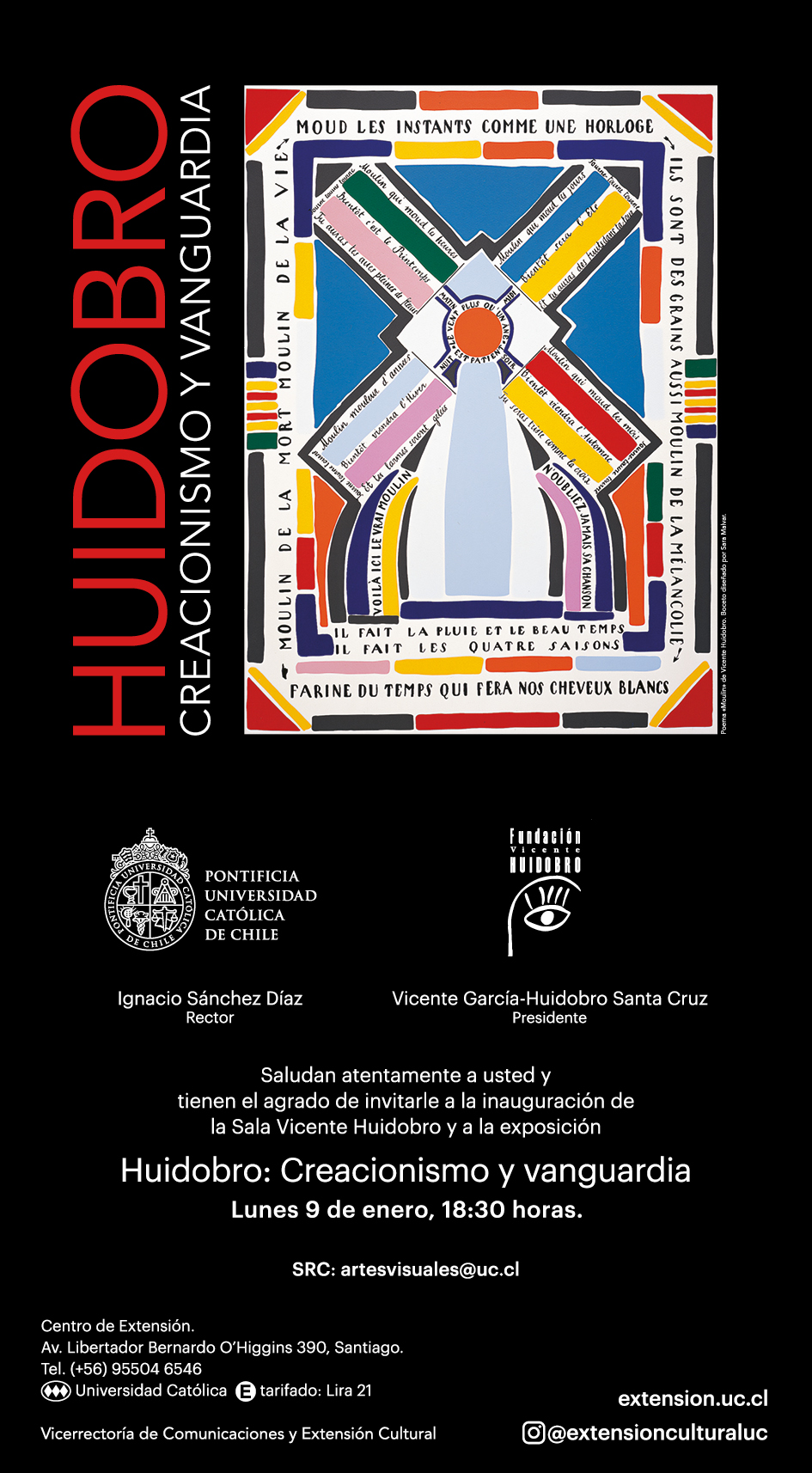 La exposición “Huidobro: creacionismo y vanguardia” estará disponible durante este primer semestre del 2023, y se proyecta que la Sala Vicente Huidobro vaya cambiando de muestras cada seis meses. Ubicada al costado izquierdo del Centro de Extensión UC Alameda, el espacio estará contiguo a la Galería Gandarillas y al Cine UC, complementando así el recorrido cultural y de acceso gratuito que existe en Alameda #390.