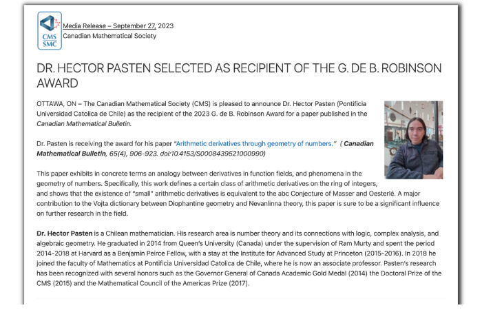La Sociedad Matemática Canadiense distinguió al investigador de la Facultad de Matemáticas, Héctor Pastén, con el premio "G. de B. Robinson Award”, que reconoce contribuciones valiosas publicadas en sus revistas Canadian Mathematical Bulletin y Canadian Journal of Mathematics.
