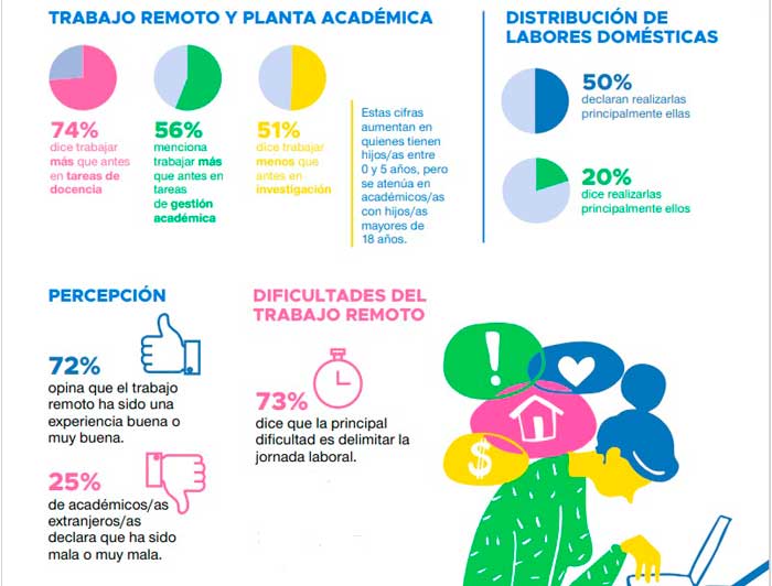 “En general, los académicos y académicas más afectados en sus labores de investigación, docencia, y gestión académica durante el confinamiento, tienen al menos un hijo o hija de entre cero y cinco años, lo que nos permitió pensar en lineamientos de apoyo y acompañamiento dirigidos a esos grupos”, comentó Silvana Zanlungo, directora de la DDA y DEG. “Por ejemplo, transmitir a las autoridades académicas que se mantengan en contacto con sus docentes, manteniendo un canal de comunicación constante para compartir información, fortalecer los vínculos y canalizar eventuales inquietudes y situaciones particulares. La Vicerrectoría Académica ha establecido consideraciones en los futuros procesos de calificación y promoción en base a los resultados detallados de la encuesta Trabajo Remoto y Planta Académica”, agregó la directora.