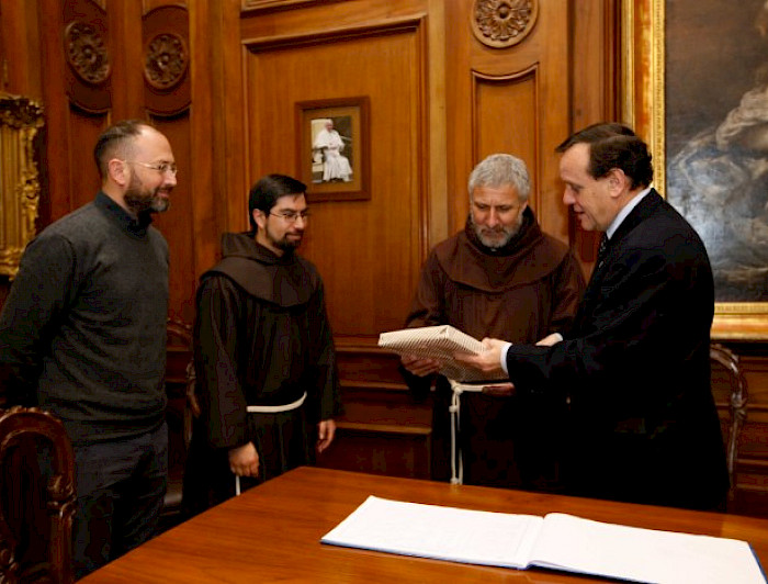 “La idea de esta firma es establecer una línea de ruta para trabajar en la conservación y la puesta en valor del patrimonio, tanto material como inmaterial, de los franciscanos. Esto va desde edificios hasta obras de arte, archivos, libros, investigaciones históricas y otros”, explicó Umberto Bonomo, director del Centro del Patrimonio Cultural de la UC, unidad que participó en la firma del convenio junto al rector Ignacio Sánchez.