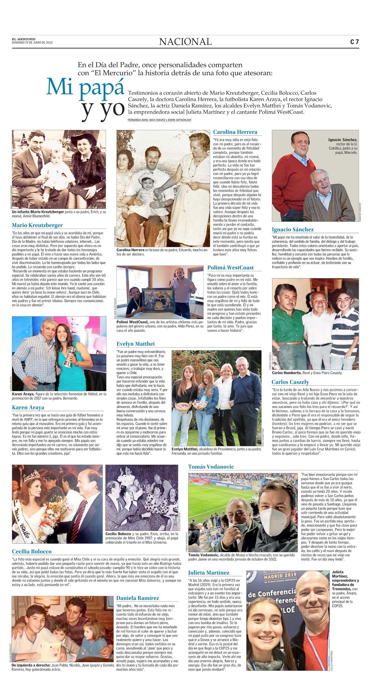 El rector de la UC también compartió el testimonio y fotografía de su propio padre, Marcelo Sánchez, en un artículo publicado por el diario El Mercurio, que reunió a diversas personalidades nacionales. “Mi papá me ha enseñado el valor de la honestidad, de la coherencia, del sentido de familia, del diálogo y del trabajo persistente. Todos estos valores orientados a aportar al país, desarrollando las capacidades que hemos recibido. Su sencillez, humildad y cercanía con todas las personas que lo rodean es un ejemplo que nos inspira. Hombre de familia, confiable y profundo en su actuar, da testimonio con su trayectoria de vida”, afirmó el rector.