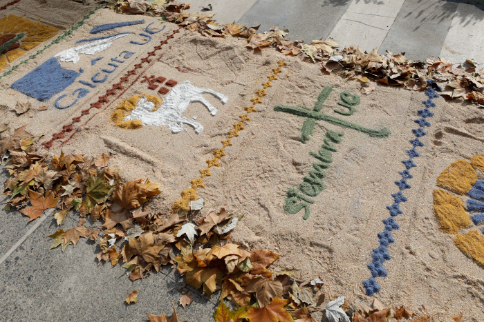 photo_camera Desde muy temprano estudiantes, académicos, administrativos y profesionales trabajaron en la creación las alfombras de aserrín como signo y símbolo de adoración, ya que sobre ellas pasaría el Santísimo Sacramento en procesión. Imagen: César Cortés