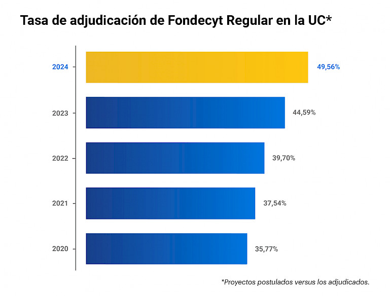 Otra de las “cifras alegres” de este año tiene que ver con la tasa de adjudicación de los Fondecyt Regular, es decir, el número de iniciativas aprobadas versus las presentadas. En 2024, esta proporción llegó a 49,56%, mientras que el año pasado fue 44,59%. También corresponde a la cifra más alta en los últimos cuatro años en la UC. Esto último, considerando los proyectos que tienen a la Universidad Católica como institución principal.