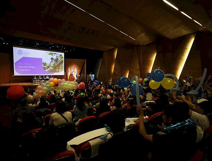 En una festiva y alegre ceremonia, que contó con la presencia de barras y numerosos cánticos, la Universidad Católica realizó el Día de la Trayectoria Laboral 2024, que fue organizada por la Dirección de Personas. La celebración incluyó el reconocimiento de la institución a 131 integrantes de la comunidad, que cumplieron 20, 25, 30, 35, 40 y 45 años de servicio a la UC, y quienes fueron vitoreados por sus equipos de trabajo en el Complejo Andrónico Luksic del campus San Joaquín.