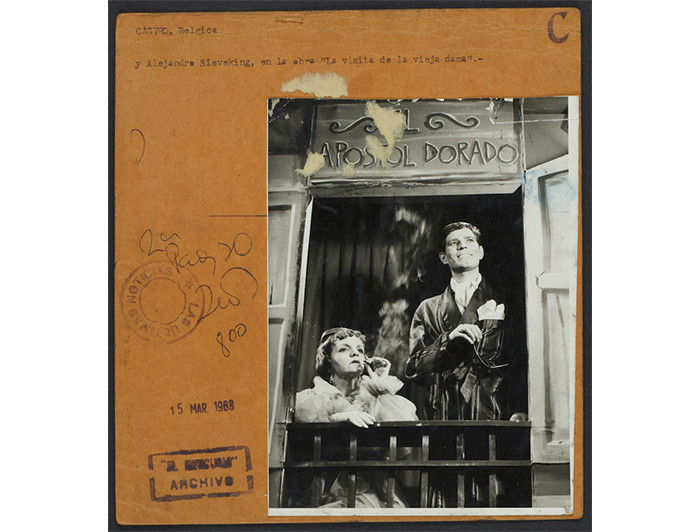 photo_camera Bélgica Castro y Alejandro Sieveking en la obra "La visita de la vieja dama". Archivo de Las últimas Noticias, 1963. Autor fotografía: desconocido. Fuente: Archivo de la Escena Teatral UC.