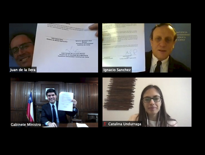 photo_camera El rector UC Ignacio Sánchez, el ministro de Bienes Nacionales Julio Isamit, el decano de Ingeniería UC Juan Carlos de la Llera y la directora de Itrend Catalina Undurraga, lideraron la firma de este convenio, el que permitirá tener una infraestructura pública de acceso abierto a datos relevantes para la investigación, el desarrollo, la innovación y el emprendimiento en el tema de resiliencia ante desastres.