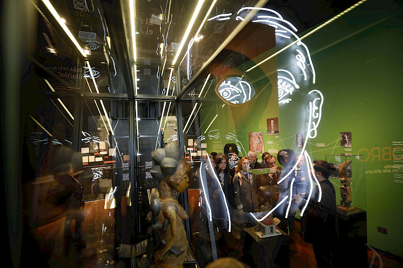 Con un diseño museológico realizado por Museal, en el espacio se mezcla el uso de neón, con paneles informativos, detalles gráficos de estética africana, material de archivo y documentación histórica, generando así una cápsula de arte y tiempo en el que las personas pueden acercarse a la experiencia de Huidobro y cómo estas creaciones africanas fueron impactando su propia producción.
