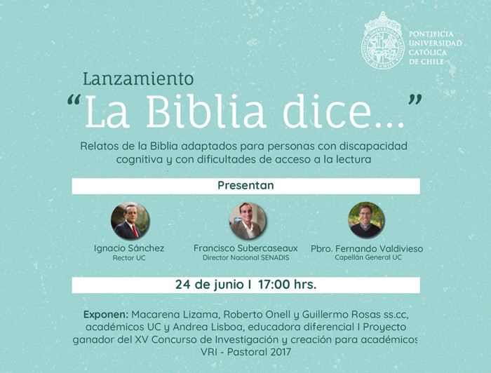 Acercar y promover la vida espiritual de aquellas personas que tienen alguna discapacidad cognitiva y con dificultad de acceso a la lectura, es el objetivo de la colección “La Biblia dice...”, iniciativa de un grupo de académicos de la Pontificia Universidad Católica de Chile, cuyo lanzamiento será este jueves 24 de junio.
