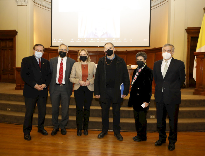 photo_camera El rector Ignacio Sánchez; el senador Francisco Chahuán; la académica Carolina Goic; el exsenador Guido Girardi; la académica Paulina Ramos, y el decano de Medicina UC, Felipe Heusser. Foto: Dirección de Comunicaciones UC