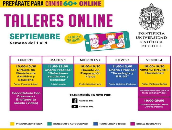 El calendario de actividades creado para este mes previo a Camina 60+ está pensado en cuatro categorías y colores. Cada día, desde la página de Facebook y canal de Youtube del evento, se transmitirán cursos y charlas en vivo.