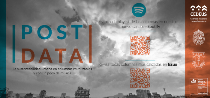 Una apuesta distinta es la que plantea el Centro de Desarrollo Urbano Sustentable, CEDEUS, con una recopilación de columnas del investigador Francisco De La Barrera sobre de diversos temas de sustentabilidad urbana, como los cerros isla en Chile, la eficiencia energética y el cambio climático. POSTDATA invita a leer las columnas en paralelo a una lista en Spotify con las canciones que las inspiraron.